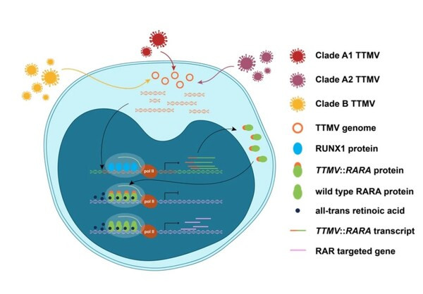 APL通常由PML::RARA融合基因驱动。由于中国专家的卓越贡献,已经使经典型的PML::RARA-APL由最凶险的白血病成为首个可以通过无化疗(全反式维甲酸ATRA+砷剂)为主的治疗获得超过90%治愈率的白血病类型。然而,近年来研究发现,在人群中广泛携带的TTMV病毒,也可在特定情况下导致APL,即TTMV::RARA-APL,但其临床与生物学特性和发病机制一直未被揭示。